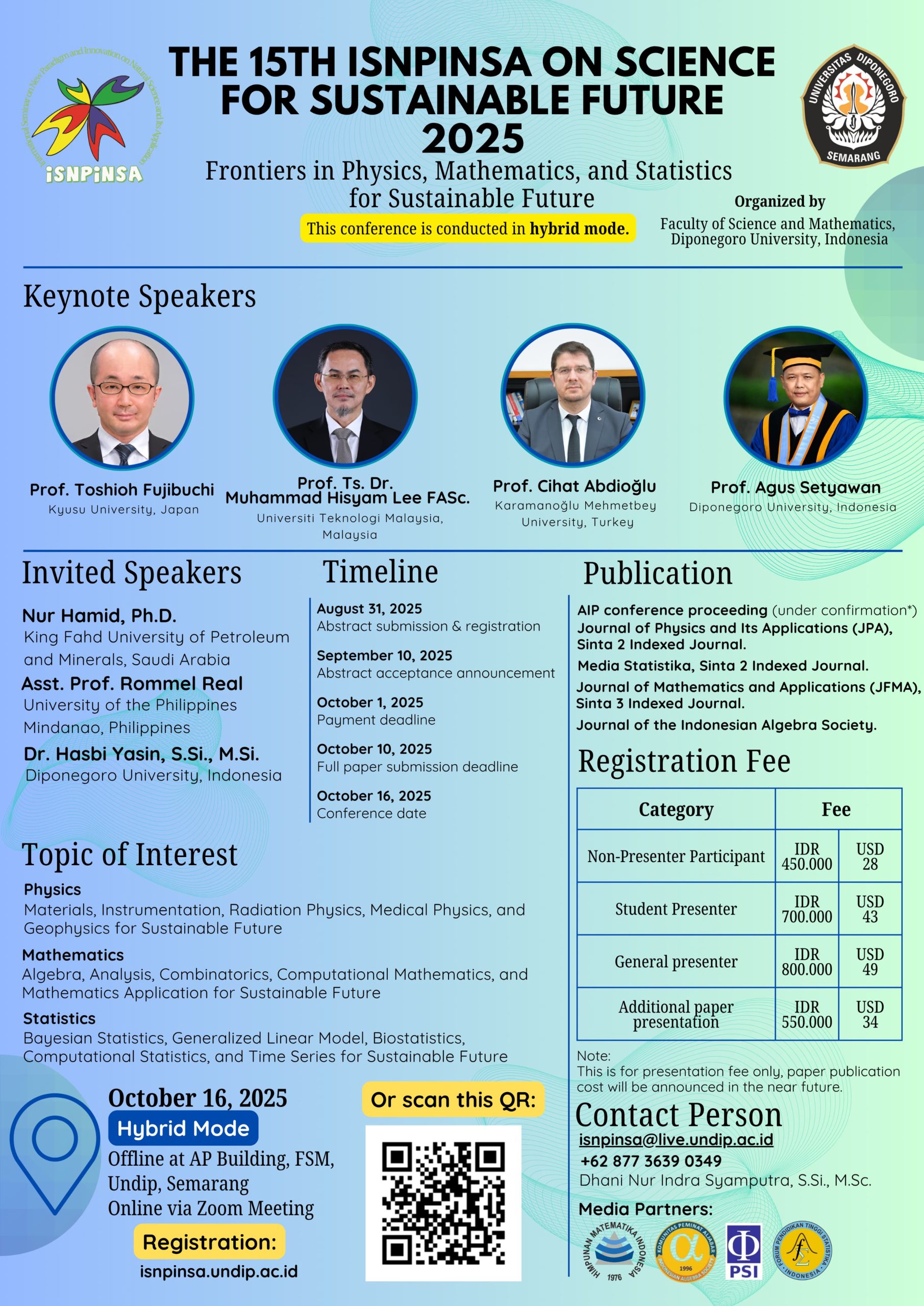 ISNPINSA 2025 menjadi wadah penting bagi para peneliti, akademisi, dan praktisi untuk berbagi penemuan terbaru dan diskusi mendalam seputar inovasi di bidang fisika, matematika, dan statistika yang relevan untuk pembangunan berkelanjutan.